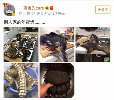 2018年2月15日(除夕)晚7時(shí),微博賬號為“一車當(dāng)先cars”的博主發(fā)布了一條名為“別人家的年夜飯……”的消息,并配發(fā)一組擺放在廚房里待烹制的熊掌、穿山甲、鱷魚等野生動(dòng)物的照片,引發(fā)了網(wǎng)民的廣泛關(guān)注和大量轉(zhuǎn)發(fā)。