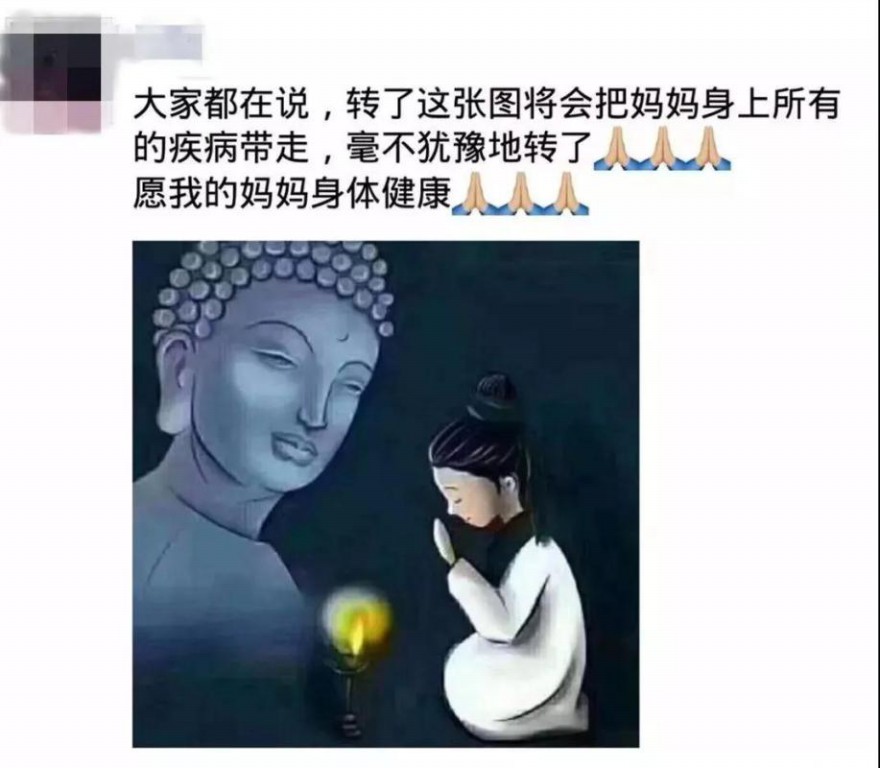 “愿母親幸福安康”、“據(jù)說這張圖會把爸媽身上的疾病帶走”……燭光下,白衣束發(fā)人士單手合十,對著慈眉善目的“菩薩”虔誠跪拜,春節(jié)假期,這幅“地藏菩薩圖”在朋友圈熱傳,不少網(wǎng)友轉(zhuǎn)發(fā)并配上祝福家人的文字。