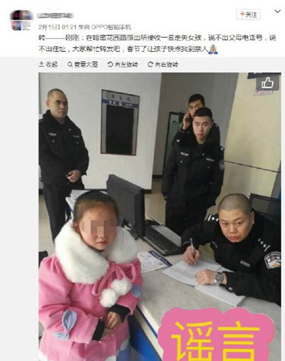 與此類似的謠言還有“在某某路派出所接收一名走失女孩,說不出父母電話號,說不出住址,大家?guī)兔D(zhuǎn)發(fā)吧,春節(jié)了讓孩子快點(diǎn)找到親人”。經(jīng)警方核實(shí),該事發(fā)生在四川省自貢市,女孩已于2月13日被其父母接回。該謠言在全國多個(gè)省市傳播,各地網(wǎng)警紛紛辟謠,請大家不要繼續(xù)傳播!