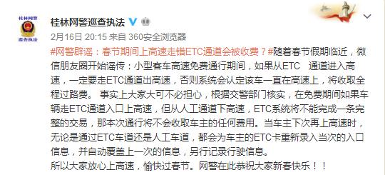 春節(jié)假期,微信朋友圈謠傳:小型客車高速免費(fèi)通行期間,如果從ETC通道進(jìn)入高速,一定要走ETC通道出高速,否則系統(tǒng)會認(rèn)定該車一直在高速上,將收取全程過路費(fèi)。