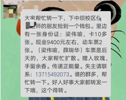 一條“失物招領(lǐng)”的信息在全國多地的微信群和朋友圈中熱傳,該信息稱:“我朋友撿到一個(gè)錢包,里邊有一張身份證:梁偉瑜,卡10多張,現(xiàn)金9400元左右,動(dòng)車票2張(梁偉瑜,薛瑞華)。車票是后天的,大家?guī)兔U(kuò)散。贈人玫瑰,手留余香。傳遞正能量。失主請聯(lián)系:1362098XXXX。誰的群多,幫忙轉(zhuǎn)一下……”
