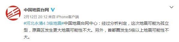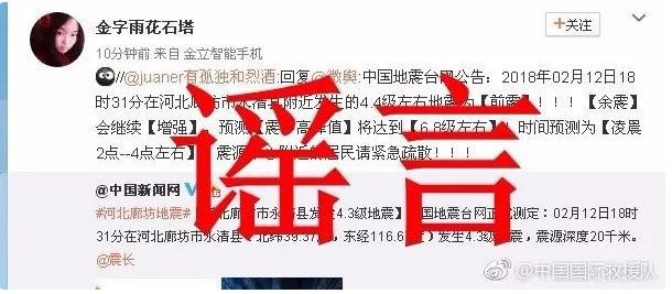 2月12日,河北永清地震發(fā)生不久后,網(wǎng)上有消息稱該縣“9958應(yīng)急救援隊(duì)接到通知,今晚11點(diǎn)30分有余震活動(dòng)!12日19時(shí)57分,河北省廊坊市人民政府新聞辦官微“廊坊發(fā)布”對此辟謠稱,“純屬謠言,公安部門正在追查謠言的源頭,請廣大群眾勿信勿傳謠言,以權(quán)威發(fā)布為準(zhǔn)!
