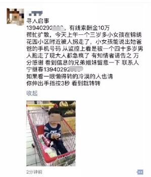 近日,多地網(wǎng)民轉(zhuǎn)發(fā)圖片稱“今天上午寧繼春的三歲女兒在錦繡花園小區(qū)附近被人拐走了,女兒能說出她爸爸的手機(jī)號碼……從監(jiān)控上看,小女孩是被一個(gè)四十多歲男人抱走了,現(xiàn)大人都急瘋了,有知情者請告之。萬分感謝……”