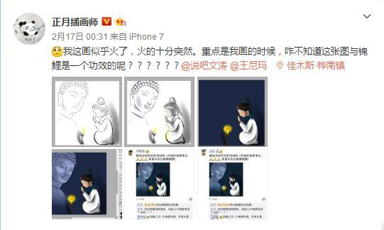 17日凌晨,該圖的原作者“正月插畫師”,微博認(rèn)證為“插畫師、美術(shù)教師”,發(fā)布消息稱“我這畫似乎火了,火的十分突然。重點(diǎn)是我畫的時(shí)候,咋不知道這張圖與錦鯉是一個(gè)功效的呢??????”