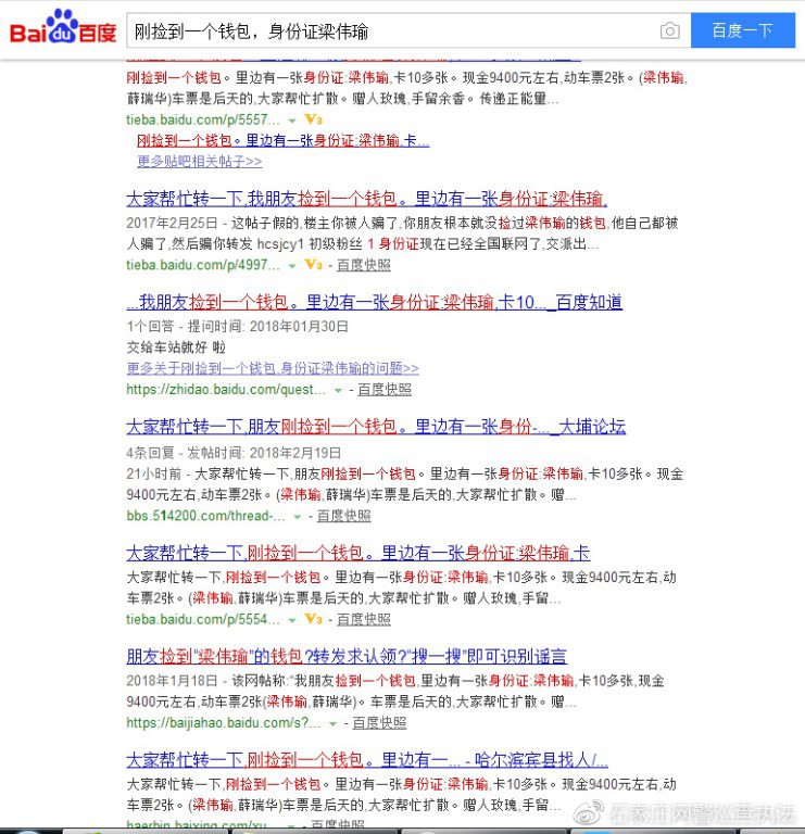 但是,經(jīng)警方調(diào)查,網(wǎng)傳消息中的聯(lián)系電話一直無法接通。該手機(jī)號碼的歸屬地顯示為廣東深圳,并被多個(gè)用戶標(biāo)記為騷擾電話。通過搜索發(fā)現(xiàn),這條“失物招領(lǐng)”在網(wǎng)絡(luò)上已經(jīng)流傳很久。除了失主的姓名“梁偉瑜”“薛瑞華”沒變之外,聯(lián)系人的電話號碼卻出現(xiàn)過多個(gè)版本,類似的“失物招領(lǐng)”虛假信息也有很多。網(wǎng)絡(luò)中流傳“徐俊峰”“劉馨心”等多人丟失錢包的網(wǎng)帖,同樣都被證明為謠言。可見,所謂的“失物招領(lǐng)”實(shí)際上是一條“陳年老謠”,只要把其中的姓名、聯(lián)系方式等信息進(jìn)行替換,這條謠言便又能改頭換面,重新在網(wǎng)絡(luò)中流傳。