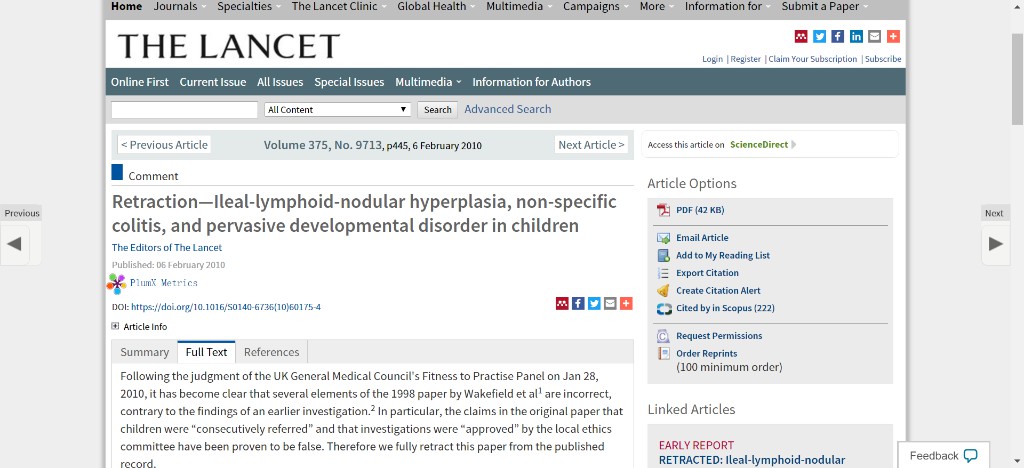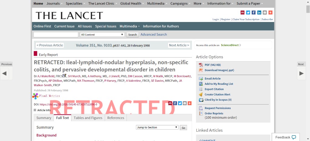 【事實(shí)】1998年,安德魯·韋克菲爾德(Andrew Wakefield)在《柳葉刀》(The Lancet)發(fā)表了一篇研究論文,該項(xiàng)研究引發(fā)了人們對(duì)麻疹、腮腺炎、風(fēng)疹疫苗與自閉癥之間可能存在的聯(lián)系的關(guān)切,這項(xiàng)研究后來被證實(shí)具有嚴(yán)重錯(cuò)誤,2010年,《柳葉刀》對(duì)論文實(shí)施了撤回。不幸的是,論文的發(fā)表引發(fā)了恐慌,導(dǎo)致疫苗的接種率下降,并隨之出現(xiàn)了相關(guān)疫情。沒有證據(jù)表明麻疹、腮腺炎、風(fēng)疹疫苗與自閉癥之間存在關(guān)聯(lián)。