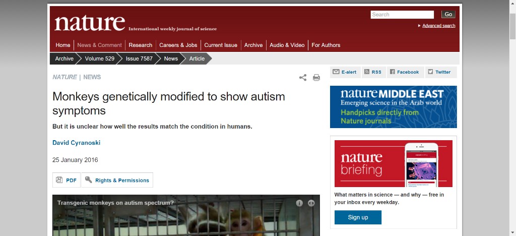 【事實(shí)】2016年,《自然》期刊發(fā)表關(guān)于“轉(zhuǎn)基因猴表現(xiàn)出孤獨(dú)癥癥狀”的研究論文。該研究由中科院上海生命科學(xué)研究院神經(jīng)科學(xué)研究所仇子龍研究組與神經(jīng)所蘇州非人靈長(zhǎng)類研究平臺(tái)孫強(qiáng)團(tuán)隊(duì)合作完成。研究通過構(gòu)建攜帶人類自閉癥基因MECP2的轉(zhuǎn)基因猴模型以及對(duì)MECP2轉(zhuǎn)基因猴進(jìn)行分子遺傳學(xué)與行為學(xué)分析,發(fā)現(xiàn)MECP2轉(zhuǎn)基因猴表現(xiàn)出類人類自閉癥的刻板行為與社交障礙等行為。