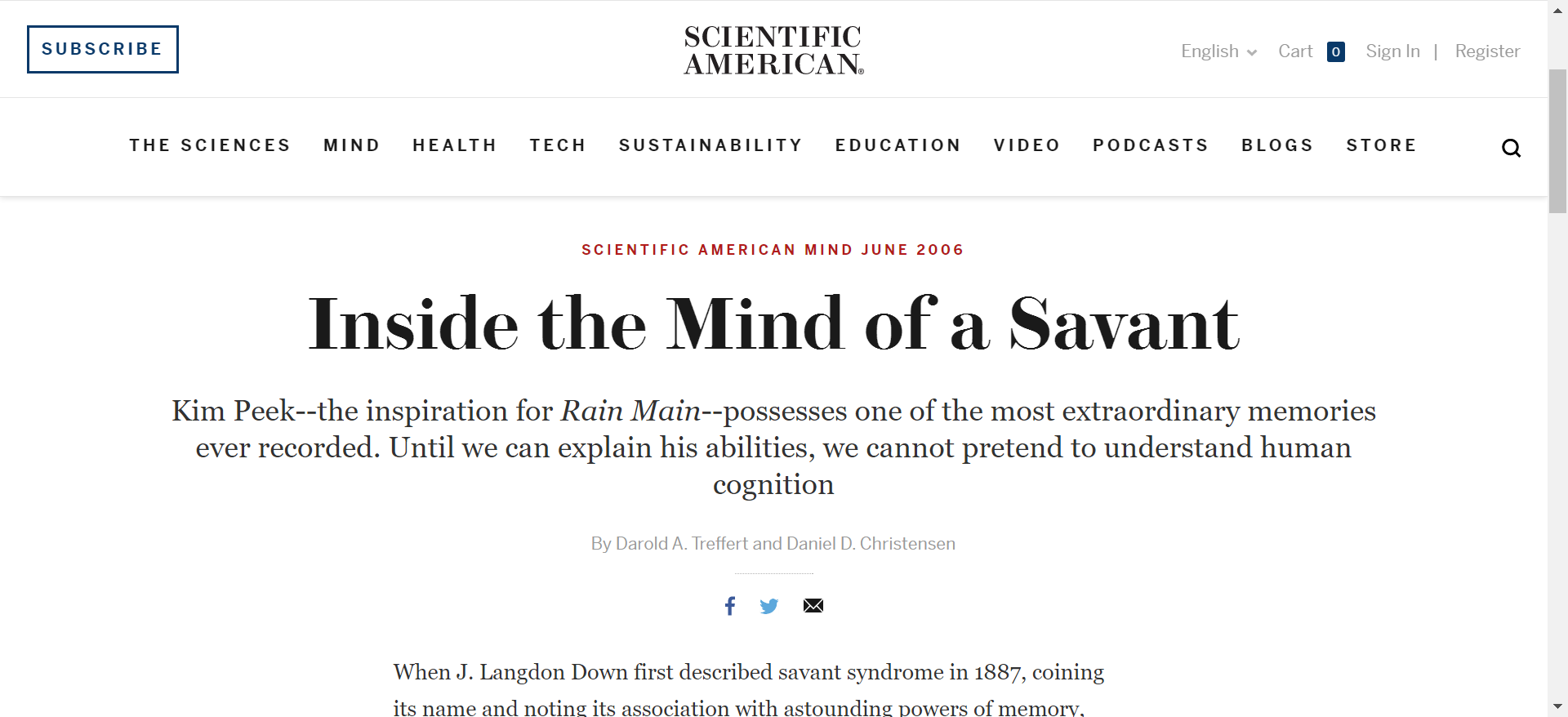 【事實(shí)】1989年,《雨人》獲第61屆奧斯卡最佳影片等四個(gè)獎(jiǎng)項(xiàng),其中男主角雷蒙的原型人物金·皮克就是一個(gè)能背誦上千本書,擁有超常記憶能力的天才。2006年6月號(hào)《科學(xué)美國(guó)人》雜志刊登了《進(jìn)入“學(xué)者”大腦》一文,認(rèn)為“我們?cè)诮忉屗哪芰χ,不能假裝理解人類的認(rèn)知能力”。以偏概全,認(rèn)為所有自閉患者都是潛在的天才是不合理的。