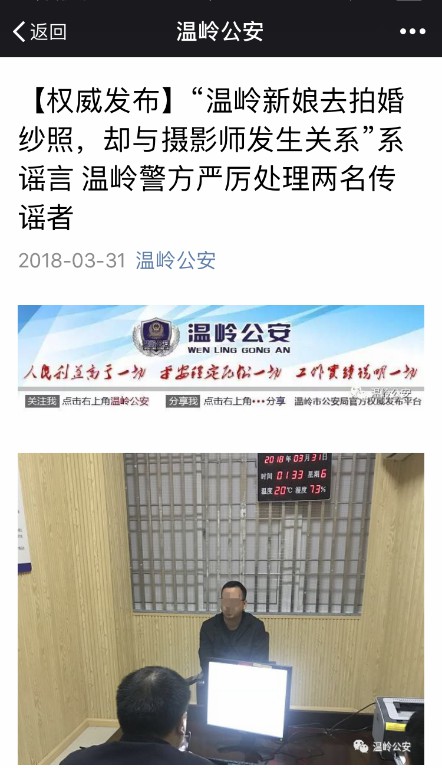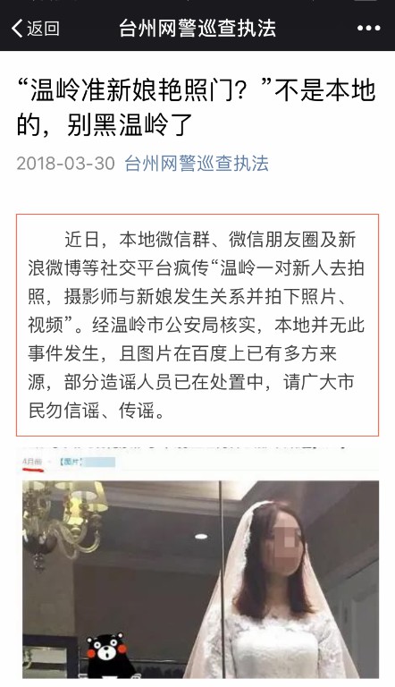3月30日,臺(tái)州市公安局網(wǎng)警官微發(fā)布消息,所謂“溫嶺準(zhǔn)新娘艷照門”不是本地的,別黑溫嶺了。其中指出,“本地并無此事件發(fā)生”,該謠言中的“圖片在百度上已有多方來源”,并稱“部分造謠人員已在處置中”。
