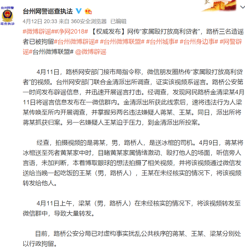人民網(wǎng)北京4月13日電 (孝金波 楊思萱)近日,一則浙江臺州“家屬毆打放高利貸者”的視頻在微信群中流傳,臺州路橋區(qū)警方迅速調(diào)查情況,澄清辟謠。4月12日,路橋公安分局對三名涉謠者處以行政拘留。