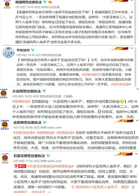 4月16日,沈陽網(wǎng)警官微回應(yīng)稱:經(jīng)核實,沈陽市公安局指揮中心并未接到有該市市民孩子被偷或者親眼見到人販子的報警及市民求助事件。丹東網(wǎng)警官微也表示:經(jīng)與該市保利物業(yè)公司核實確認(rèn),保利物業(yè)也并沒有張貼過相關(guān)圖片或者“告示”。