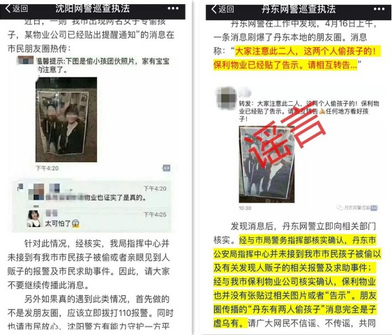 該則消息在沈陽的網(wǎng)民朋友圈中打著“溫馨提示”的名號,聲稱“下圖是偷小孩團伙照片,家要有寶寶的注意了”。丹東流傳的版本則為“大家注意此二人,這兩個人偷孩子的!保利物業(yè)已經(jīng)貼了告示。請相互轉(zhuǎn)告...”