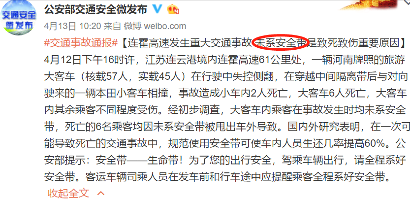 4月12日下午,江蘇連云港境內(nèi)連霍高速61公里處,一輛河南牌照的旅游大客車在行駛中失控側(cè)翻,在穿越中間隔離帶后與對(duì)向駛來的一輛本田小客車相撞,事故造成小車內(nèi)2人死亡,大客車6人死亡,大客車內(nèi)其余乘客不同程度受傷。經(jīng)初步調(diào)查,大客車內(nèi)乘客在事故發(fā)生時(shí)均未系安全帶,死亡的6名乘客均因未系安全帶被甩出車外導(dǎo)致。