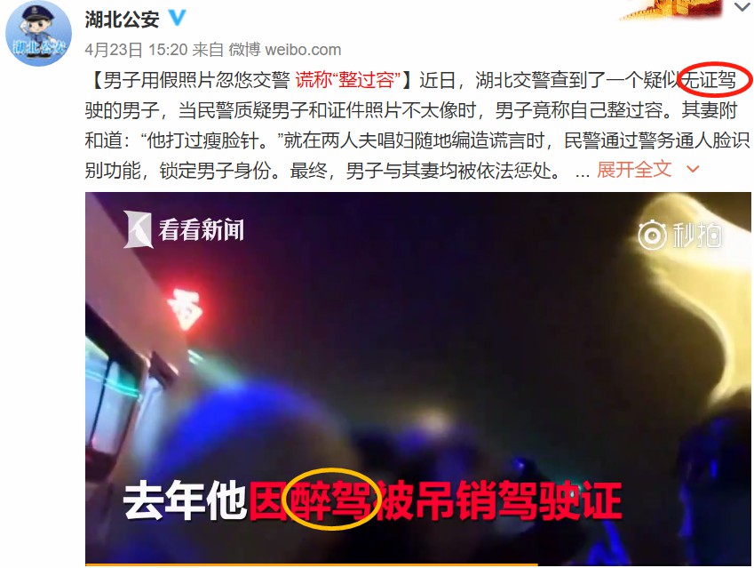 據(jù)“湖北公安”4月23日稱,近日,湖北交警查到了一個(gè)疑似無證駕駛的男子,當(dāng)民警質(zhì)疑男子和證件照片不太像時(shí),男子竟稱自己整過容。其妻附和道:“他打過瘦臉針。”就在兩人夫唱婦隨地編造謊言時(shí),民警通過警務(wù)通人臉識(shí)別功能,鎖定男子身份。該男子去年因醉駕被吊銷駕駛證,最終,男子與其妻均被依法懲處。