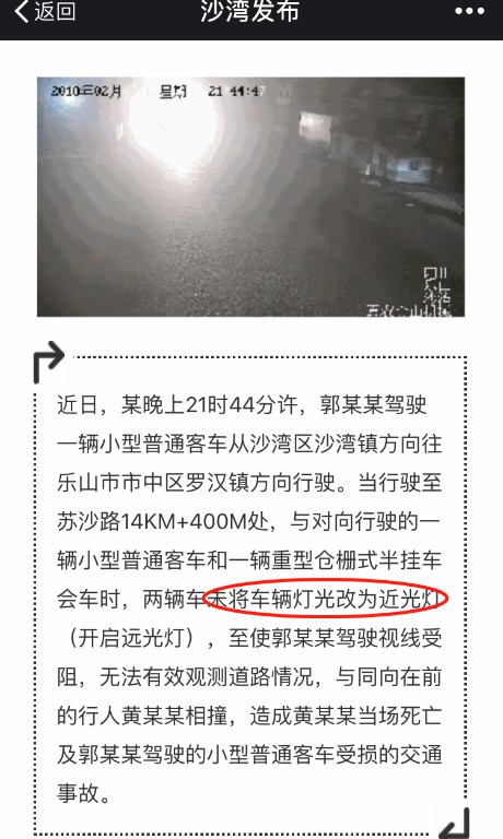 據(jù)“沙灣發(fā)布”4月26日?qǐng)?bào)道,近日,某晚上21時(shí)44分許,郭某某駕駛一輛小型普通客車從四川省樂山市沙灣區(qū)沙灣鎮(zhèn)方向往樂山市市中區(qū)羅漢鎮(zhèn)方向行駛。當(dāng)行駛至蘇沙路14KM+400M處,與對(duì)向行駛的一輛小型普通客車和一輛重型倉柵式半掛車會(huì)車時(shí),兩輛車未將車輛燈光改為近光燈(開啟遠(yuǎn)光燈),至使郭某某駕駛視線受阻,無法有效觀測(cè)道路情況,與同向在前的行人黃某某相撞,造成黃某某當(dāng)場(chǎng)死亡及郭某某駕駛的小型普通客車受損的交通事故。