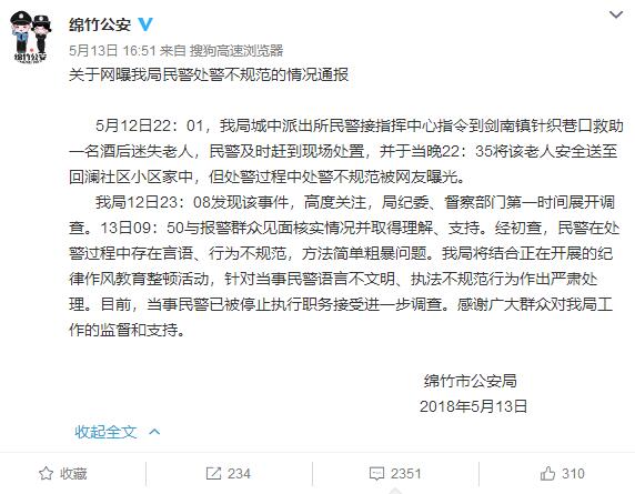 5月13日下午,綿竹市公安局官方微博對此事進(jìn)行了通報:5月12日22:01,綿竹市公安局城中派出所民警接指揮中心指令到劍南鎮(zhèn)針織巷口救助一名酒后迷失老人,民警及時趕到現(xiàn)場處置,并于當(dāng)晚22:35將該老人安全送至回瀾社區(qū)小區(qū)家中,但處警過程中處警不規(guī)范被網(wǎng)友曝光。