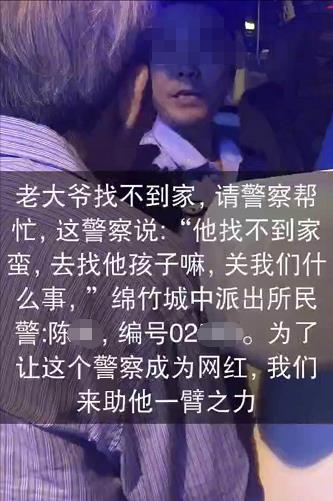 這段9秒長的視頻開頭以醒目的字幕顯示“老大爺找不到家,請警察幫忙,這警察說:‘他找不到家,去找他孩子嘛,關(guān)我們什么事,’綿竹城中派出所民警:陳某,編號02***。為了讓這個警察成為網(wǎng)紅,我們來助他一臂之力”。從視頻中,可以看出當(dāng)時是夜晚,一位老人雙手在胸前,手指交叉相握,向坐在警車?yán)锩娴囊晃幻窬笾。但該民警稱:“本身找人就不該我們找”。接著,旁邊的一位女士對該民警說,這個老大爺找不到家了,你們可不可以幫一下。該民警打斷女士的話稱,老大爺找不到家可以找他兒子,關(guān)我們啥子事。接著,該民警用右手直接用力拍向鏡頭。
