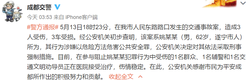 5月14日凌晨3時(shí)53分,成都交警通報(bào),此事故造成3人受傷,3車(chē)受損。經(jīng)當(dāng)?shù)毓矙C(jī)關(guān)初步查明,該案系62歲遂寧市姚某某所為,其行為涉嫌以危險(xiǎn)方法危害公共安全罪,公安機(jī)關(guān)決定對(duì)其依法采取刑事強(qiáng)制措施。目前,在參與阻止姚某某犯罪行為中受傷的1名群眾、1名輔警和1名交通文明勸導(dǎo)員正在醫(yī)院接受治療,傷情穩(wěn)定。公安機(jī)關(guān)感謝市民為平安成都所作出的積極努力和貢獻(xiàn)。
