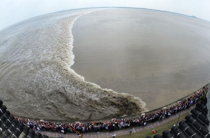 2016年9月18日,記者在浙江海寧市鹽官鎮(zhèn)占鰲塔上拍攝的錢(qián)塘江“一線潮”。新華社記者 黃宗治 攝