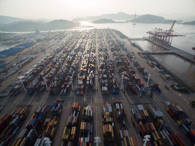 2017年5月9日拍攝的寧波舟山港穿山港區(qū)集裝箱碼頭,以北侖港為核心的寧波舟山港年貨物吞吐量連續(xù)9年位居世界第一。新華社記者 黃宗治 攝