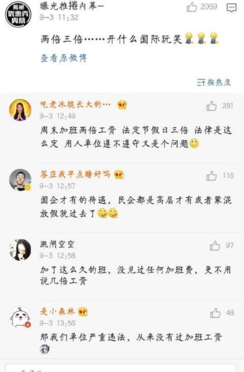 當(dāng)然,對(duì)于節(jié)假日給加班工資,網(wǎng)友也有話要說(shuō)。“我們單位從來(lái)沒(méi)有給過(guò)加班工資”“兩倍、三倍,開(kāi)什么國(guó)際玩笑?”“法律是這么規(guī)定的,用人單位遵不遵守又是個(gè)問(wèn)題。”……看來(lái),加不加班是個(gè)問(wèn)題,能不能得到加班工資更是一個(gè)問(wèn)題。