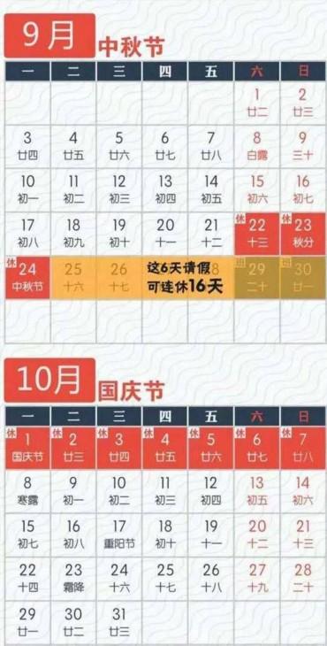 今年中秋節(jié)9月22日到24日放假,國(guó)慶節(jié)10月1日到7日放假。兩個(gè)假期隔了6天。這不,已經(jīng)有網(wǎng)友制定了兩份拼假攻略。