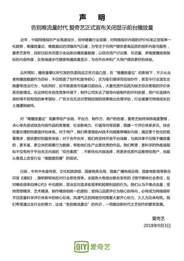 愛奇藝首席內(nèi)容官王曉暉對媒體稱,過度關(guān)注播放量給行業(yè)帶來了諸多不良影響,大量的優(yōu)質(zhì)作品因為缺乏客觀、公正的評估體系被埋沒。不少從業(yè)者更將播放量簡單攀比,扭曲了創(chuàng)作初心,甚至滋生出刷量等違法或者違反職業(yè)道德的行為。對于“唯播放量論”的不良現(xiàn)象,以及由此帶給產(chǎn)業(yè)鏈、平臺、制作方、用戶的傷害,我們保持高度的警惕。為了改變這種不良風(fēng)氣,愛奇藝決定率先關(guān)閉前臺播放量顯示,將重心回歸創(chuàng)作并為用戶提供優(yōu)質(zhì)的內(nèi)容和服務(wù)體驗。