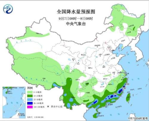 9月7日08時(shí)至8日08時(shí),內(nèi)蒙古東北部、東北部地區(qū)中北部、新疆沿天山地區(qū)、青藏高原大部、西南地區(qū)大部、江南大部、華南和臺灣島等地有小到中雨或雷陣雨,其中,江南東南部、華南和云南中西部等地的部分地區(qū)有大雨,局地有暴雨或大暴雨(100~130毫米)(見圖1),并伴有短時(shí)強(qiáng)降水、雷暴大風(fēng)或冰雹等強(qiáng)對流天氣。甘肅西北部、內(nèi)蒙古中部、華北北部、山東東部、遼寧南部等地有4~6級風(fēng)。