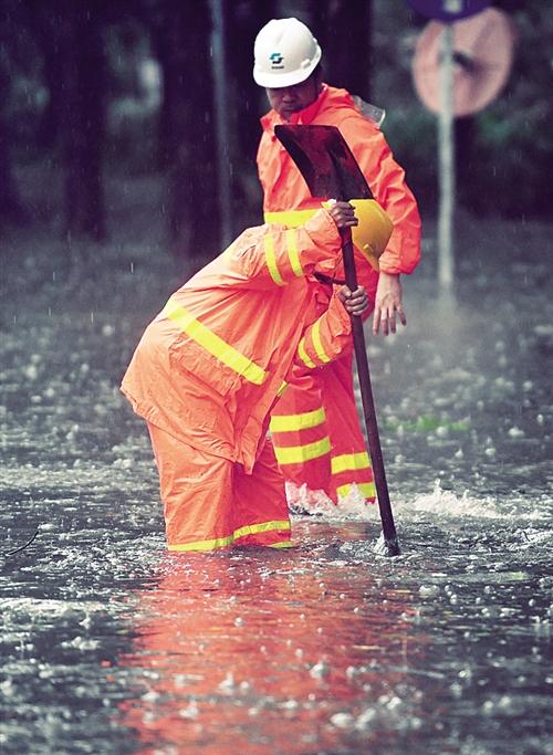 9月16日,在深圳市福田區(qū),工作人員在疏通下水道。新華社記者 毛思倩攝