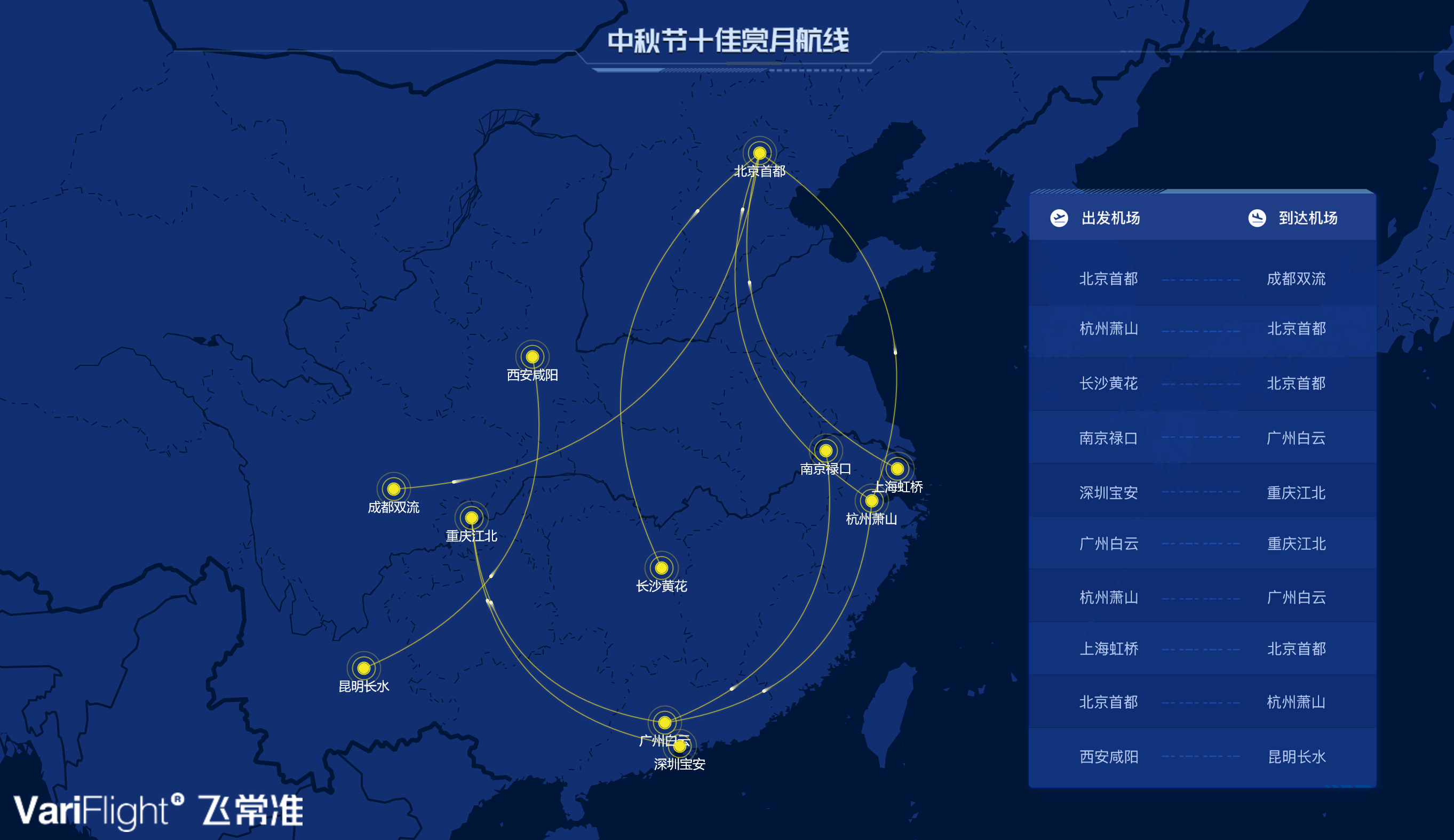 飛常準(zhǔn)大數(shù)據(jù)顯示,今年中秋節(jié)十佳賞月航線(xiàn)分別是北京首都-成都雙流、杭州蕭山-北京首都、長(zhǎng)沙黃花-北京首都、南京祿口-廣州白云、深圳寶安-重慶江北、廣州白云-重慶江北、杭州蕭山-廣州白云、上海虹橋-北京首都、北京首都-杭州蕭山、西安咸陽(yáng)-昆明長(zhǎng)水。