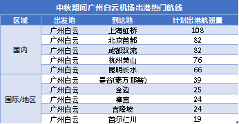 中秋期間廣州白云機(jī)場(chǎng)出港熱門(mén)航線(xiàn)。