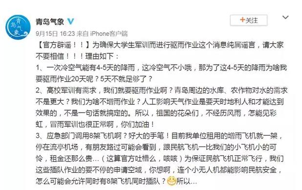 9月15日,青島市專(zhuān)業(yè)氣象臺(tái)“@青島氣象”發(fā)布微博辟謠,稱“為確保大學(xué)生軍訓(xùn)而進(jìn)行驅(qū)雨作業(yè)”這個(gè)消息純屬謠言,請(qǐng)網(wǎng)友們不要相信。
