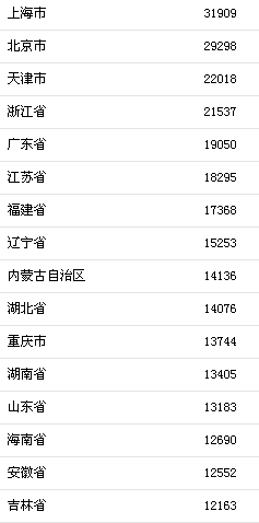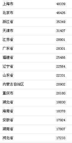 前三季度收入榜:上海48339元最高