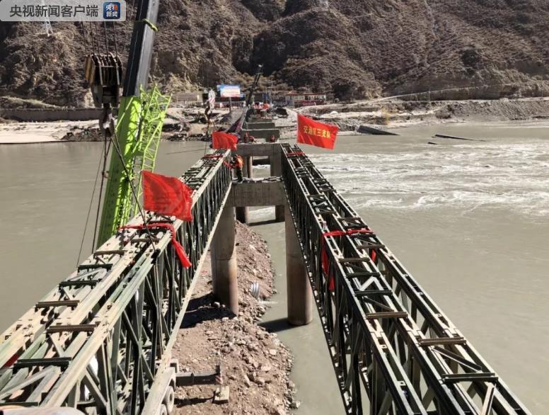 11月25日12時40分,經(jīng)過武警某部交通三支隊官兵連續(xù)晝夜奮戰(zhàn),被沖毀的金沙江大橋成功吊裝起第一跨,標(biāo)志著318國道搶通取得突破性進(jìn)展。