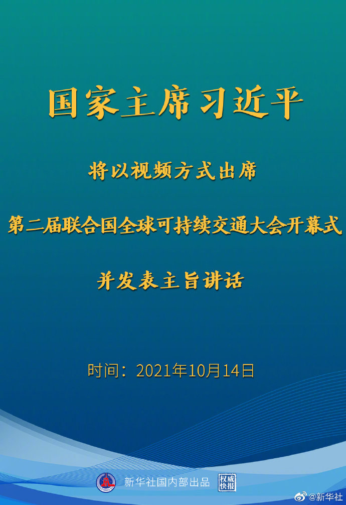 新華社北京10月13日電 外交部發(fā)言人華春瑩13日宣布:國家主席習(xí)近平將于10月14日以視頻方式出席第二屆聯(lián)合國全球可持續(xù)交通大會開幕式并發(fā)表主旨講話。MqA安康新聞網(wǎng)