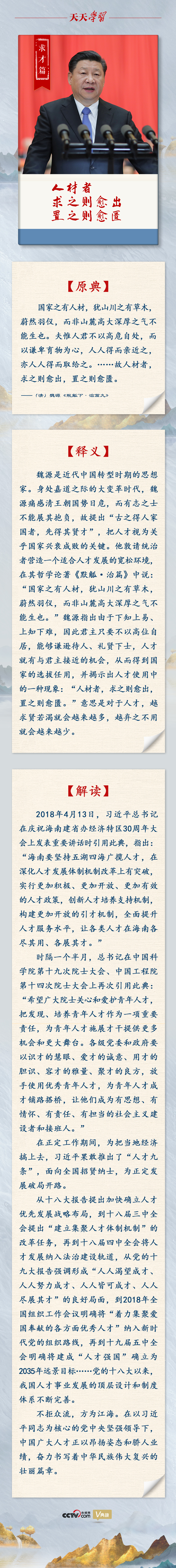 編者按:中央人才工作會(huì)議9月27日至28日在北京召開(kāi),習(xí)近平總書(shū)記出席會(huì)議并發(fā)表重要講話。黨的十八大以來(lái),總書(shū)記站在黨和國(guó)家事業(yè)發(fā)展全局的戰(zhàn)略高度,對(duì)我國(guó)人才事業(yè)發(fā)展作出一系列重要指示。在講話和文章中,他大量引用有關(guān)中國(guó)古代人才思想的典故,就如何選才、敬才、求才、育才、用才等話題,提出了一系列新思想、新觀點(diǎn)、新論斷、新要求,為新時(shí)代做好人才工作提供了根本遵循和行動(dòng)指南。《天天學(xué)習(xí)》帶您一起學(xué)習(xí)回顧。