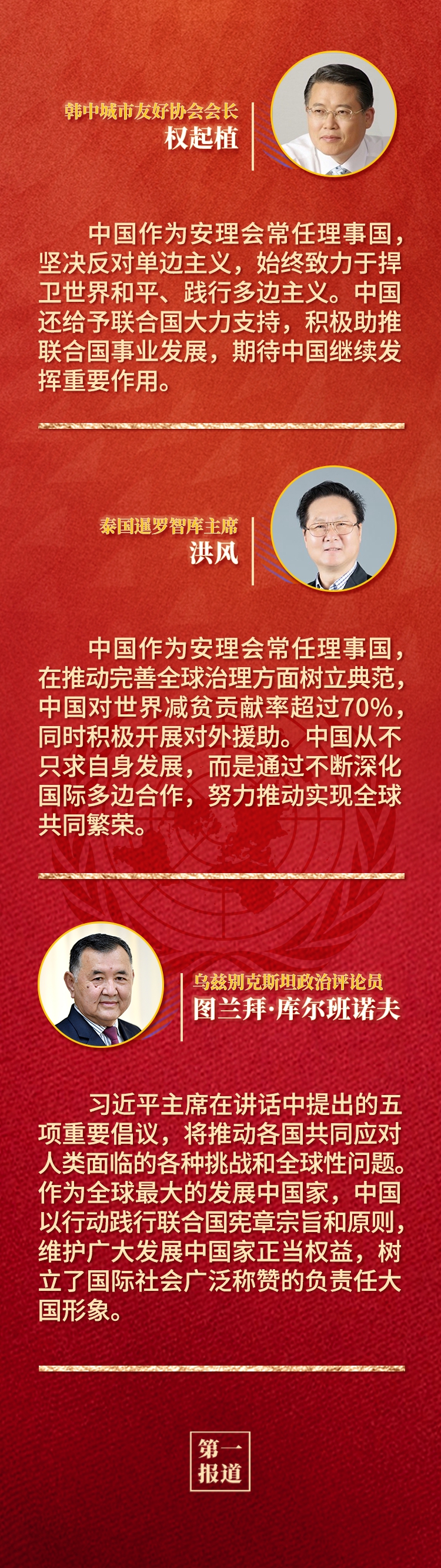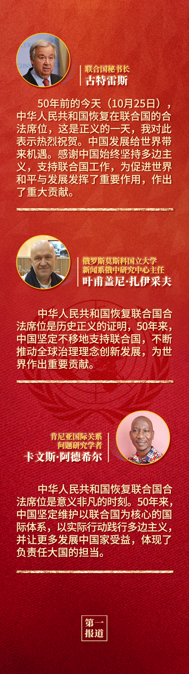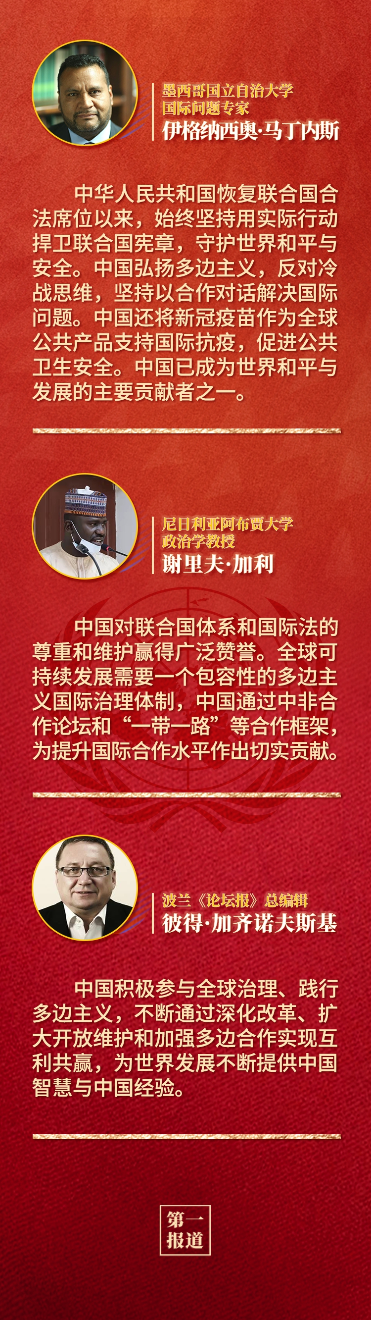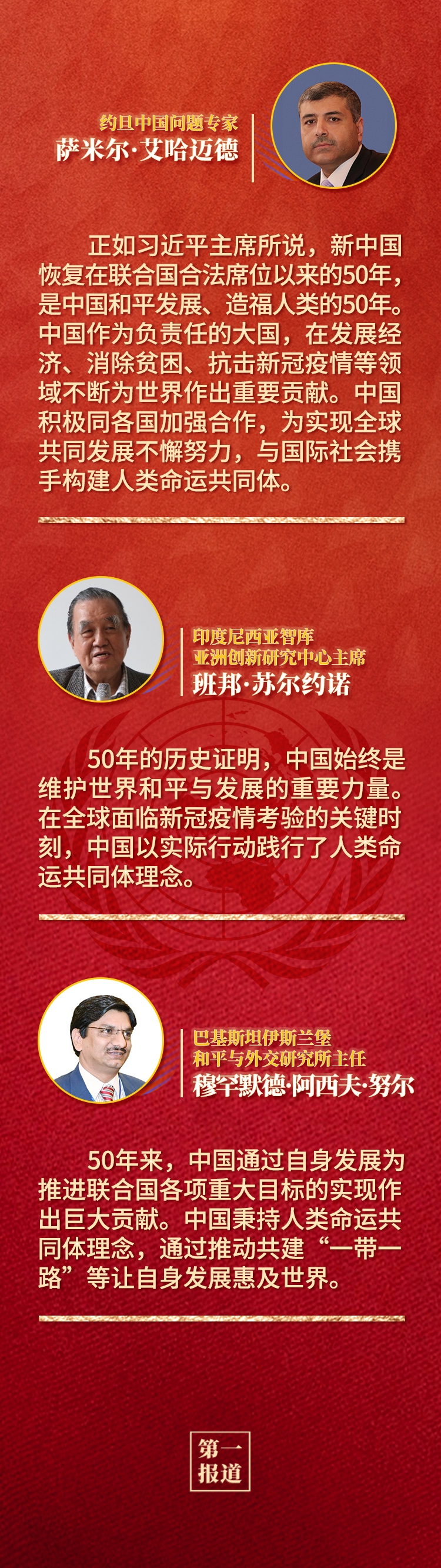 多國人士認為,中華人民共和國恢復聯(lián)合國合法席位是世界和聯(lián)合國歷史上的一個大事件,習近平主席的重要講話回顧了中國和平發(fā)展、造福人類的50年,為實現(xiàn)世界永續(xù)和平發(fā)展提出重要倡議,為全球共同推動構建人類命運共同體注入新的強大動力。