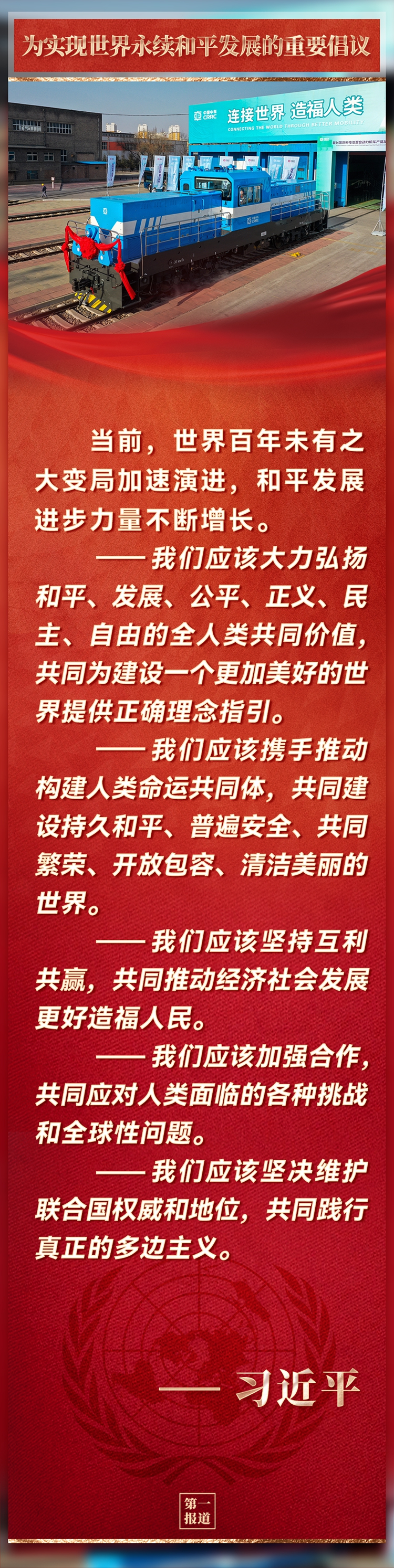 在中華人民共和國恢復聯(lián)合國合法席位50周年紀念會議上,習近平主席提出重要倡議。國際社會看到,中國智慧和中國方案再次為實現(xiàn)世界永續(xù)和平發(fā)展注入動力。