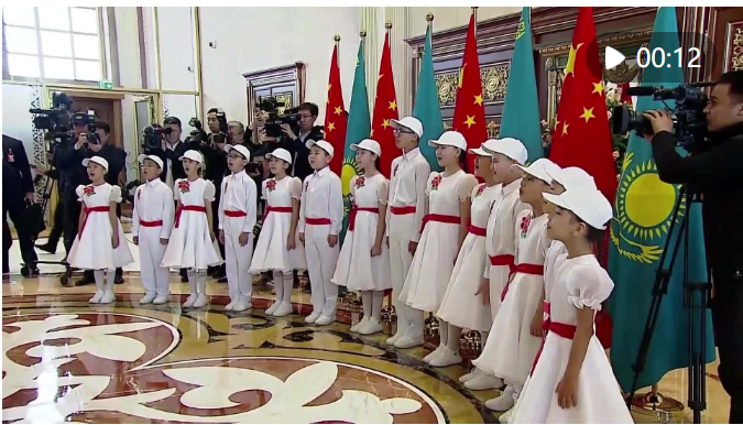 十余名哈薩克斯坦少年兒童用中文演唱《歌唱祖國(guó)》,熱烈歡迎習(xí)近平主席到訪。
