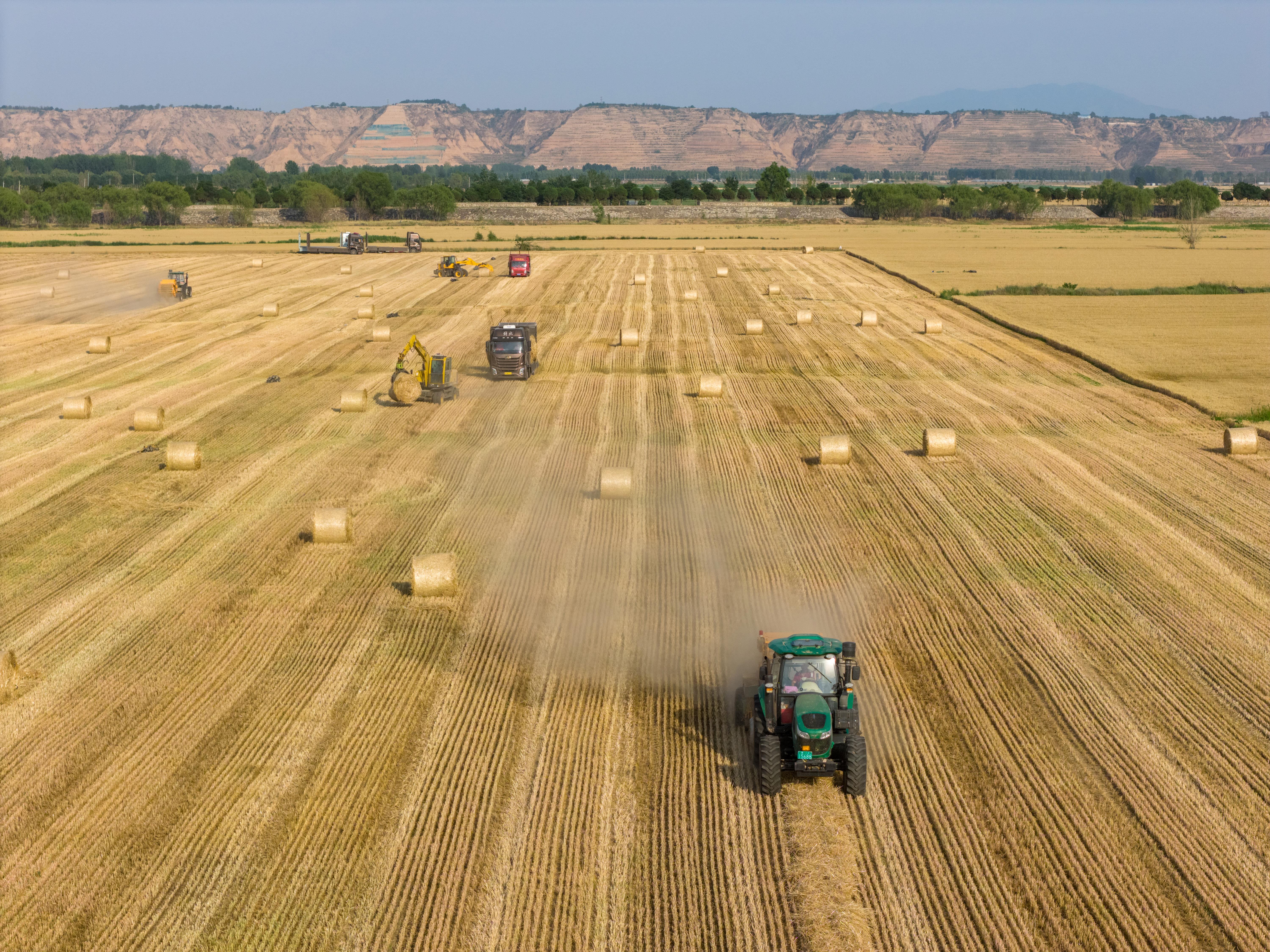 △據(jù)國(guó)家統(tǒng)計(jì)局發(fā)布的數(shù)據(jù),2025年全國(guó)夏糧總產(chǎn)量14973.8萬(wàn)噸,實(shí)現(xiàn)穩(wěn)產(chǎn)豐收。圖為今年6月,山西運(yùn)城裴莊鎮(zhèn)黃河灘涂上,農(nóng)機(jī)手忙著實(shí)施小麥秸稈打捆和裝車運(yùn)輸作業(yè)。