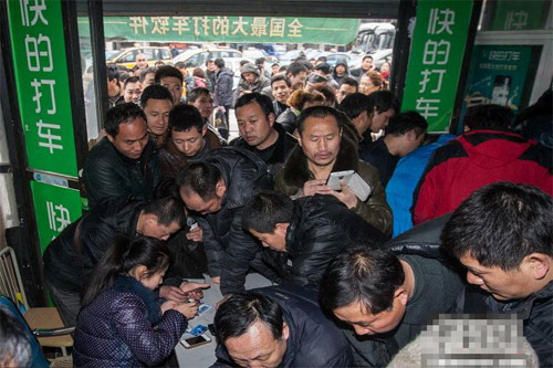 2014年2月19日,杭州“快的打車”服務(wù)點,出租車司機們排隊安裝軟件。圖片來源:CFP視覺中國2014年2月19日,杭州,隨著“嘀嘀”、“快的”……