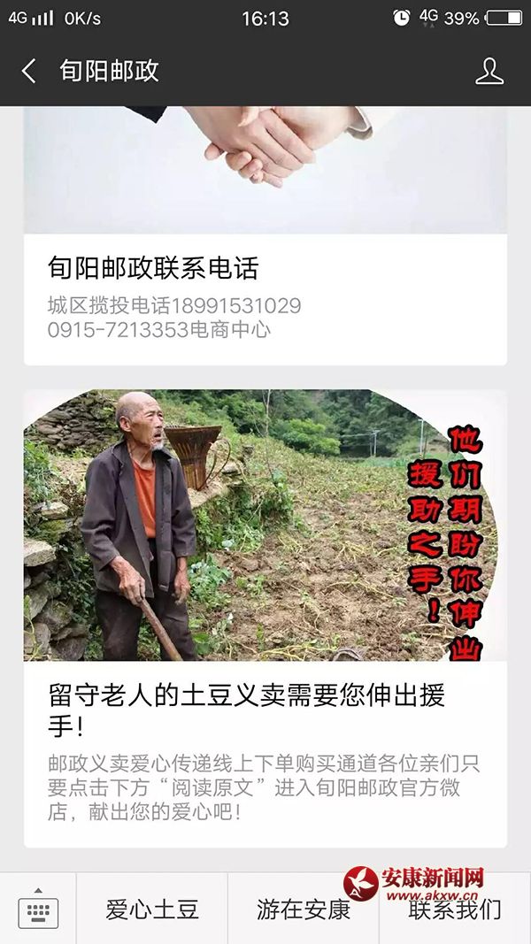 一是關(guān)注旬陽郵政微信公眾號,點擊右下角的“愛心土豆”鏈接,進入旬陽郵政官方微店直接購買;