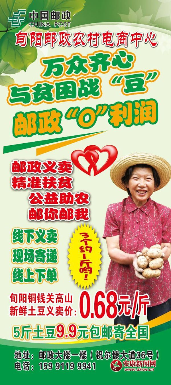進村高價回收、線下低價義賣:旬陽郵政公司已經(jīng)與銅錢關(guān)鎮(zhèn)黨委、鎮(zhèn)政府對接聯(lián)合,赴沙陽河村收購高山新鮮土豆0.70元/斤,現(xiàn)場義賣0.68元/斤。對,你沒有看錯,真正的高價收購,低價義賣,只為貧困戶的勞動有尊嚴。定于2018年7月1日8點30分至晚上8點,在旬陽郵政大樓一樓農(nóng)村電商運營中心開展“助力農(nóng)戶脫貧暨愛心匯聚銅錢關(guān)土豆義賣活動”。