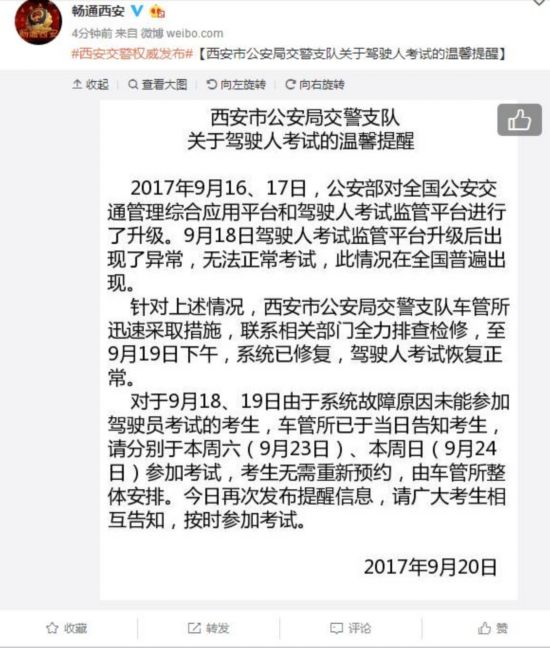 西安市交警支隊表示,因2017年9月16、17日,公安部對全國公安交通管理綜合應(yīng)用平臺和駕駛?cè)丝荚嚤O(jiān)管平臺進行了升級。9月18日駕駛?cè)丝荚嚤O(jiān)管平臺出現(xiàn)了異常,無法正?荚嚕饲闆r在全國普遍出現(xiàn)。