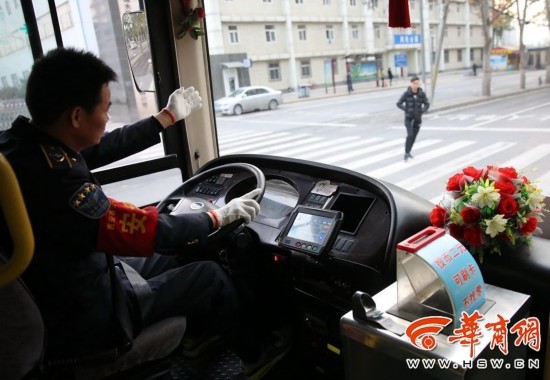 800路公交車司機趙紅權(quán)師傅在在斑馬線前停車讓行人,并揮手示意讓行人放心通行。 華商報記者 鄧小衛(wèi) 攝