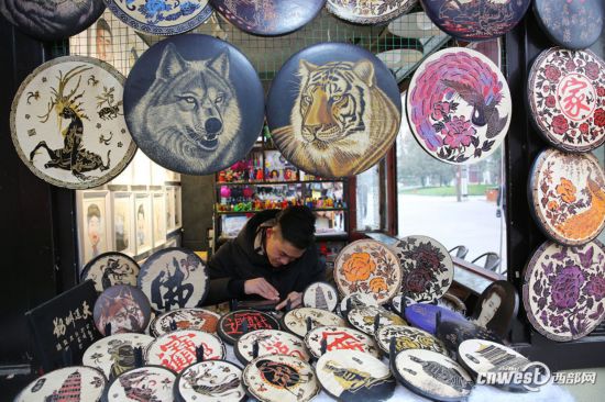 12月13日,西安大雁塔景區(qū),22歲小伙陳鵬聚精會(huì)神地在一塊圓形木板上雕刻著。他的面前掛滿了一幅幅大大小小的木版畫,其中的老虎和狼毫發(fā)畢現(xiàn),活靈活現(xiàn),雕刻的十分精細(xì)。5zr安康新聞網(wǎng)