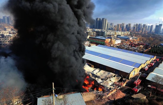 楊家灣村是典型的城中村,路兩側(cè)是村民自建的樓房,四五層、高低不等,一家挨著一家。著火的倉(cāng)庫(kù)在路西側(cè),圍墻磚混結(jié)構(gòu),頂棚是彩鋼板。從衛(wèi)星地圖上看,一共三部分組成,呈現(xiàn)出一個(gè)不規(guī)則的三角形。此時(shí)的起火現(xiàn)場(chǎng),火焰呈團(tuán)狀輪番卷滾上來,記者目測(cè),火焰最高時(shí)超過10米。