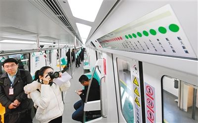 與目前開通的地鐵三條線路列車不同,四號(hào)線列車的座位旁邊沒有設(shè)置玻璃擋板,顯得更加開闊。報(bào)站的屏幕顯示著當(dāng)前實(shí)時(shí)時(shí)間、本趟列車終點(diǎn)站以及下一站,29座車站的字體變大,紅色燈表示已經(jīng)走過的車站,綠色燈表示將要到達(dá)的車站,讓乘客更易看清。