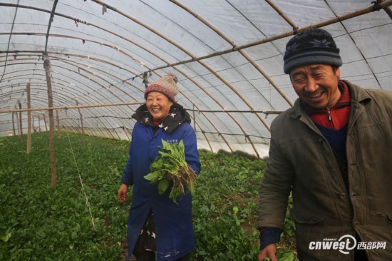 1月28日,安康鎮(zhèn)坪縣板橋村,陳維兵、何登琴夫妻在家門口的蔬菜大棚收菜,看著綠油油的菠菜,夫妻倆心里特開心。(記者 魏永賢)