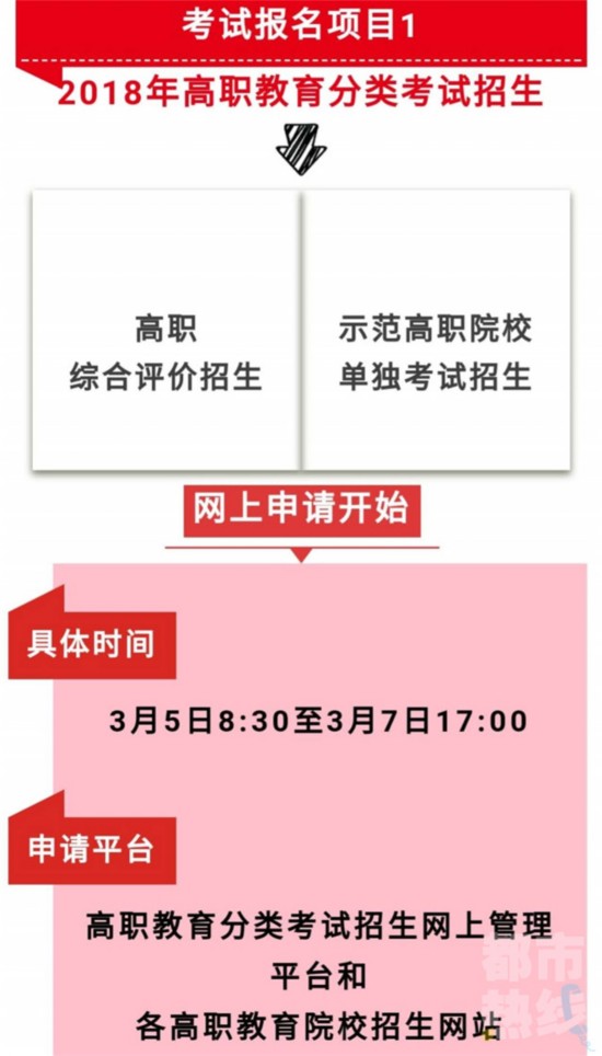 今年,參加分類考試招生的示范高職院校,由15所增加到18所。申請示范高職院校的考生,在提出入學申請后,于3月17號參加統(tǒng)一命題的筆試考試,科目為語數(shù)外三科,總分為300分,成績在18所院校間通用;面試由各院校自行組織,考查考生的職業(yè)適應(yīng)性,是否符合報考專業(yè)要求,總分為200分。